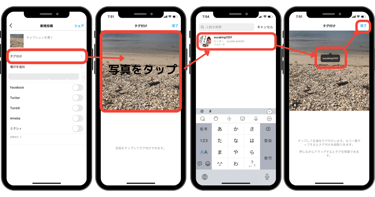 タグ付けとは、例えばその写真に一緒に写っている友人や、一緒だった人のアカウントを表示させることができます。