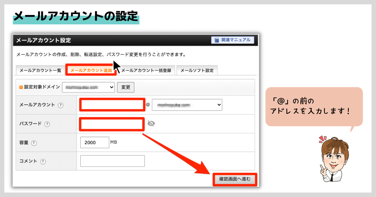 メールアカウントの情報を入力したら、「確認画面へ進む」をクリックします。