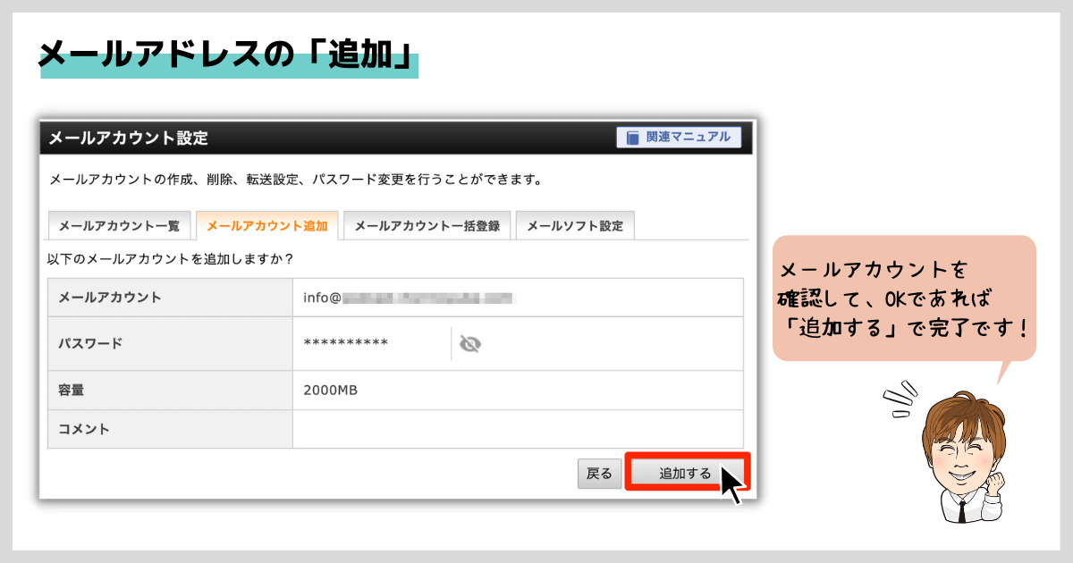 「メールアカウント追加」をクリックし、そこからメールの情報を入力していきます。