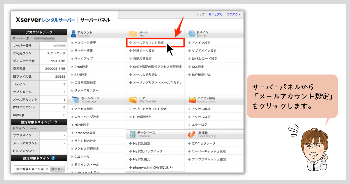 エックスサーバーの サーバーパネルにログインして、「メールアカウント設定」をクリックします。