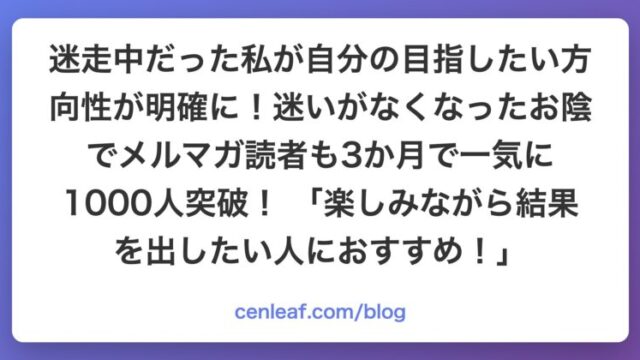 事例・ケーススタディ 迷走中だった私が自分の目指したい方向性が明確に!迷いがなくなったお陰でメルマガ読者も3か月で一気に1000人突破! 「楽しみながら結果を出したい人におすすめ!」 2025年12月11日 suzaki